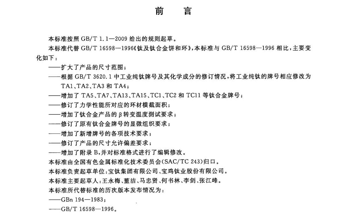 《鈦及鈦合金餅和環國家標準GB/T 16598-2013》,本標準規定了鈦合金餅鈦環材的技術要求、試驗方法、檢驗規則和標志、包裝、運輸、儲存及質量證明書與訂貨單(或合同)內容。