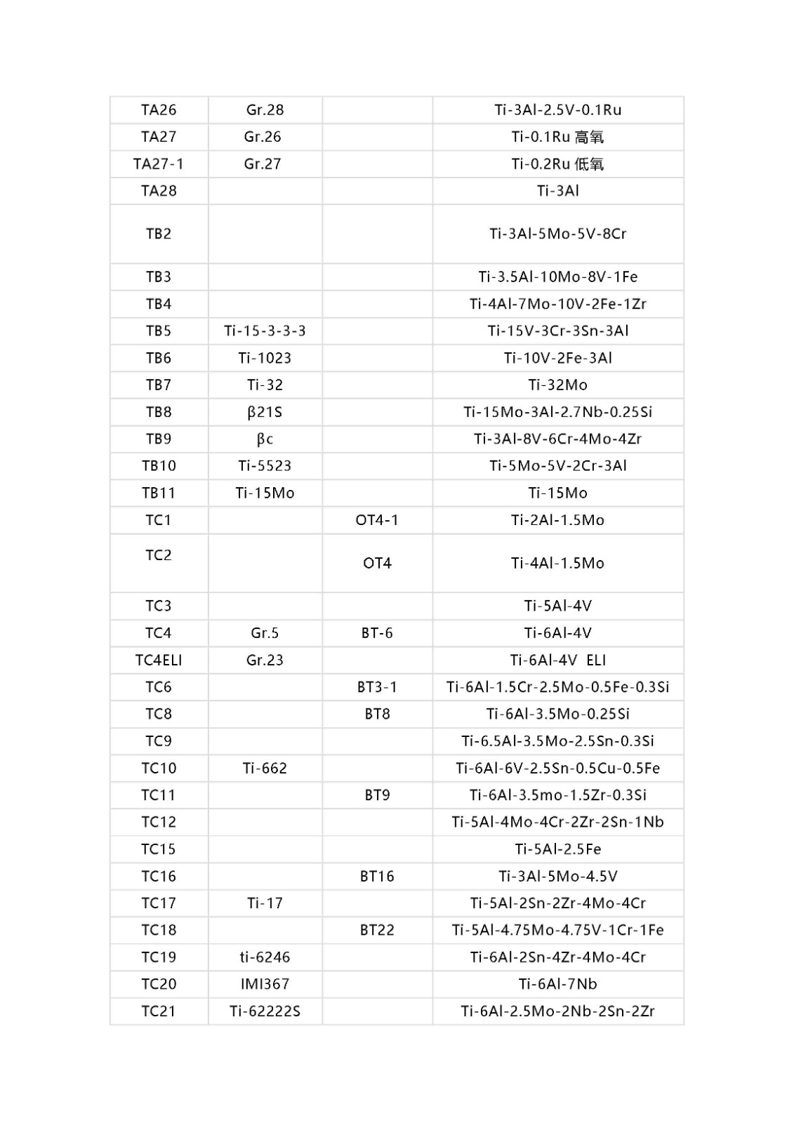 鈦及鈦合金牌號相對應的國外牌號以及名義化學成分